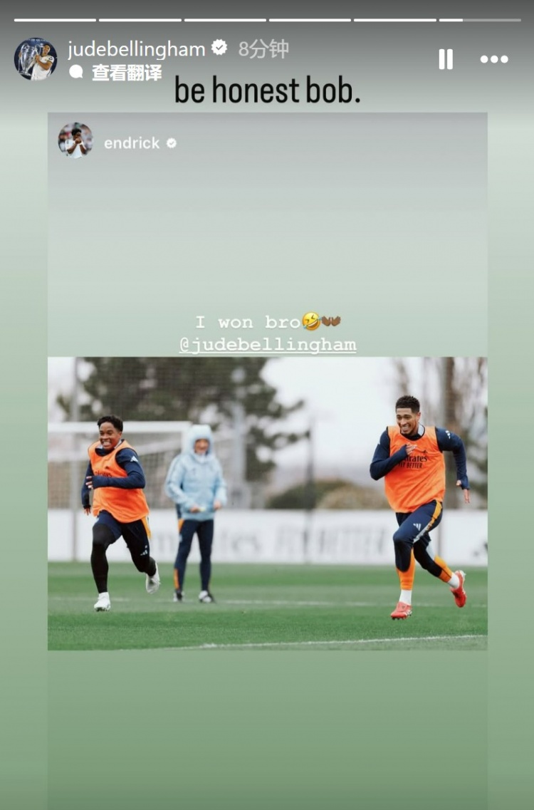 恩德里克晒出自己和贝林厄姆赛跑的照片,并调侃道:“兄弟,我赢了。”贝林回答他:“诚实点,小老弟。”