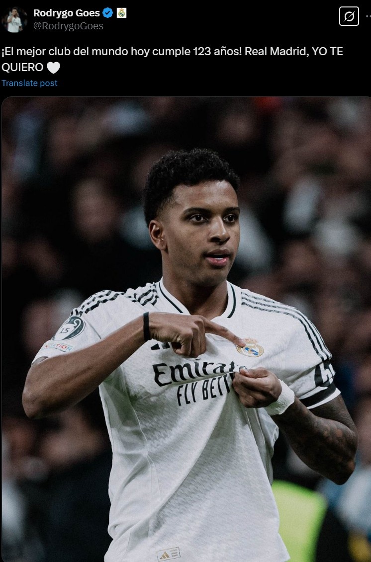 罗德里戈在社媒配文写道:“世界最佳球队今天123岁了,皇马,我爱你!”
