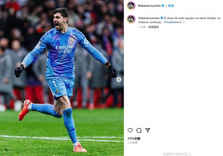 3月13日讯 皇马在本轮欧冠点球淘汰马竞,库尔图瓦面对老东家表现神勇做出7次扑救,堪称全场最佳。他也在赛后通过社媒晒出自己的狂奔庆祝照,并配文:“这支球队的意志力永无止境!故