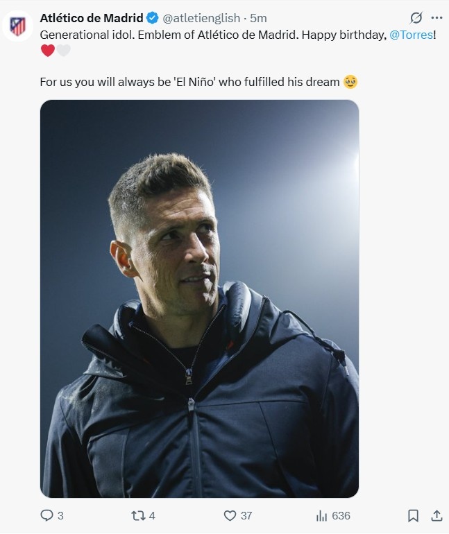马竞官方表示道:“一代偶像,马竞的象征,生日快乐托雷斯!❤️
