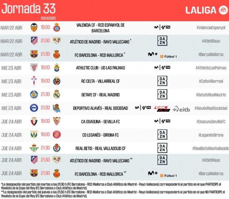 3月27日讯 西甲官方公布第33轮比赛时间,皇马4月24日3:30出战赫塔费,巴萨和马竞的比赛时间视国王杯半决赛结果而定。
