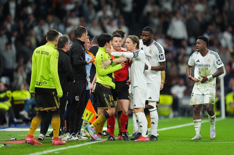比赛加时赛下半场,奥拉萨加斯蒂铲翻维尼修斯,双方发生冲突。其中,莫德里奇被拍到掐久保建英。