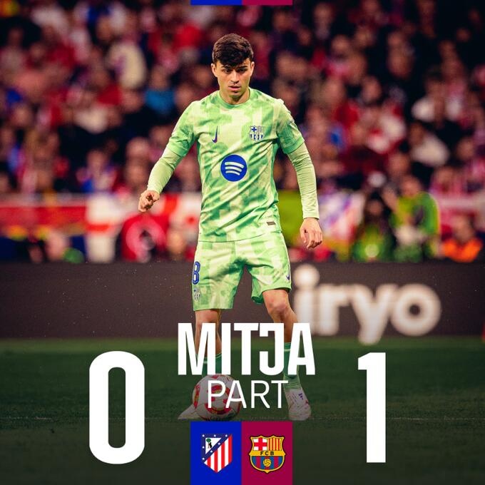上半场比赛结束,巴塞罗那客场暂时1-0领先马竞,总比分巴萨5-4领先马竞。