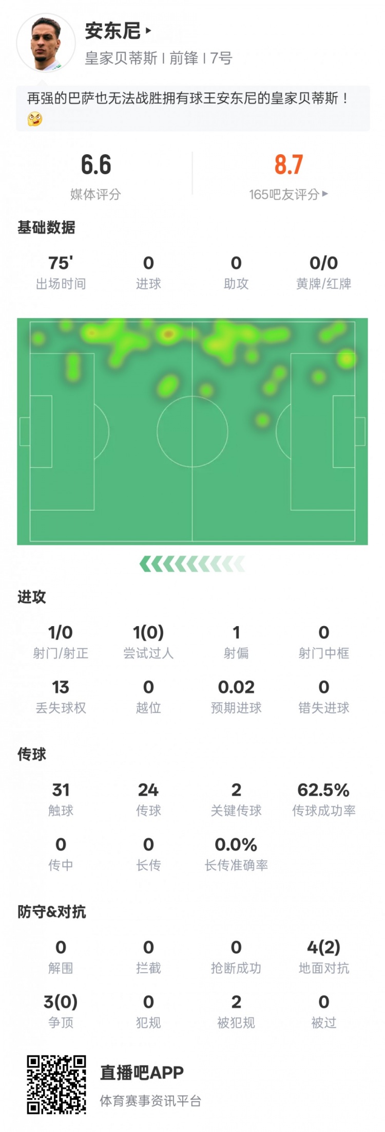 安东尼本场比赛具体数据如下: