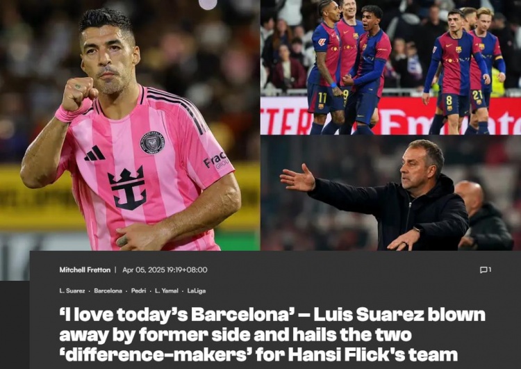 苏亚雷斯:我很喜欢这支巴萨的球风,佩德里和亚马尔太突出了