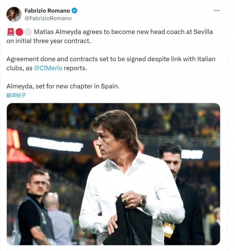 罗马诺透露,尽管与意大利俱乐部有联系,但阿尔梅达已经与塞维利亚就执教事宜达成协议,同意出任球队新帅,即将签署为期3年的合同。