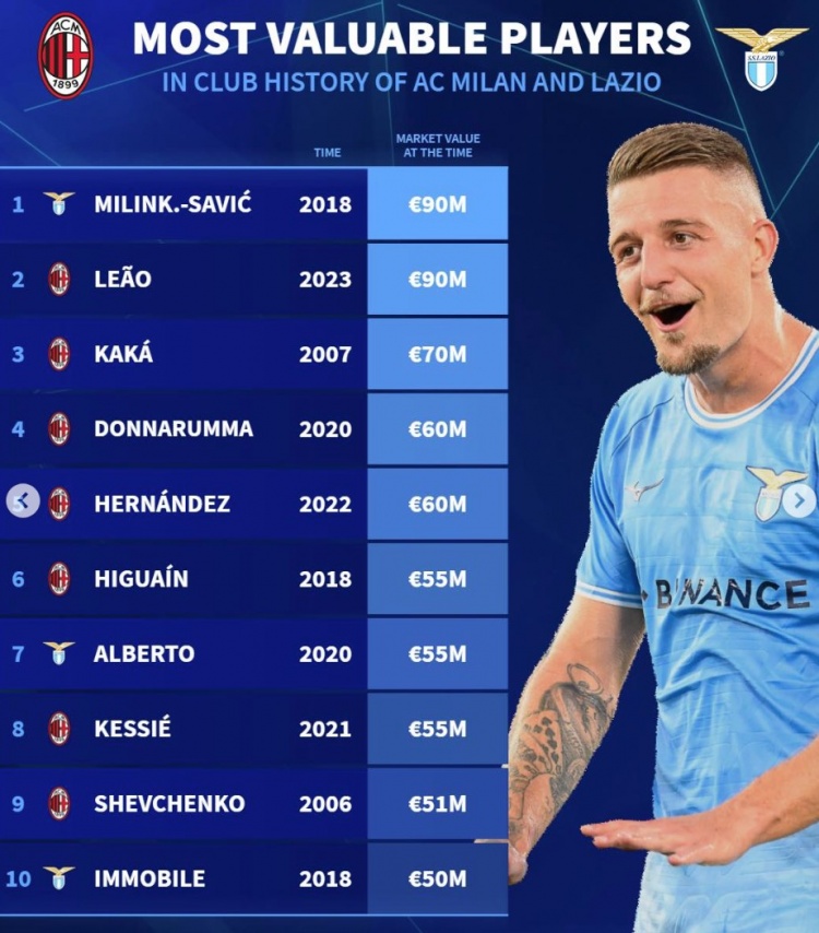 3月3日讯 米兰将在本轮意甲焦点战主场迎战拉齐奥,《转会市场》也列出了两队历史德转身价最贵榜单。
