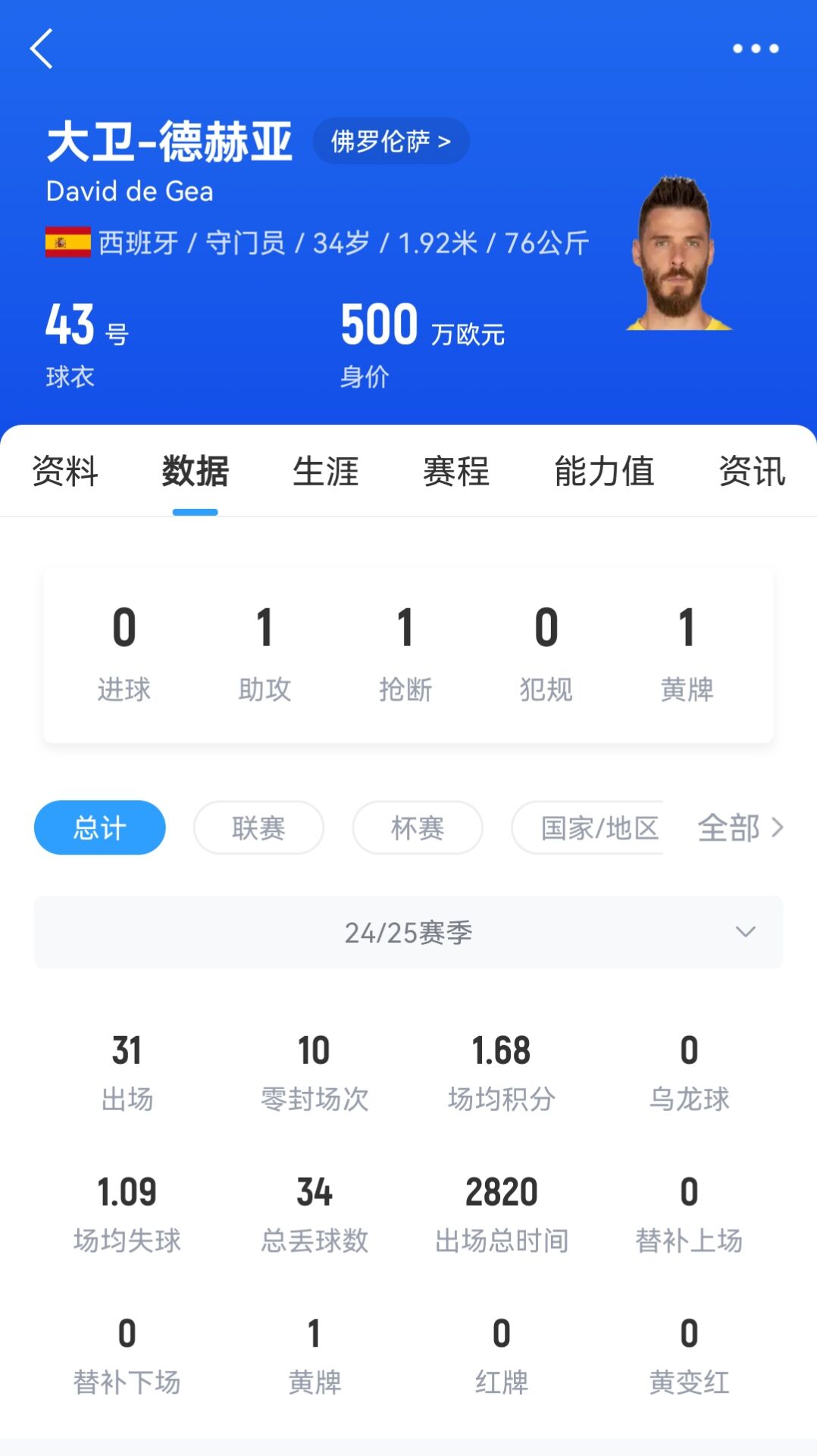 去年夏天佛罗伦萨签下自由身的德赫亚,在本赛季34岁的德赫亚表现出色,出战31场比赛,完成10次零封,丢34球。