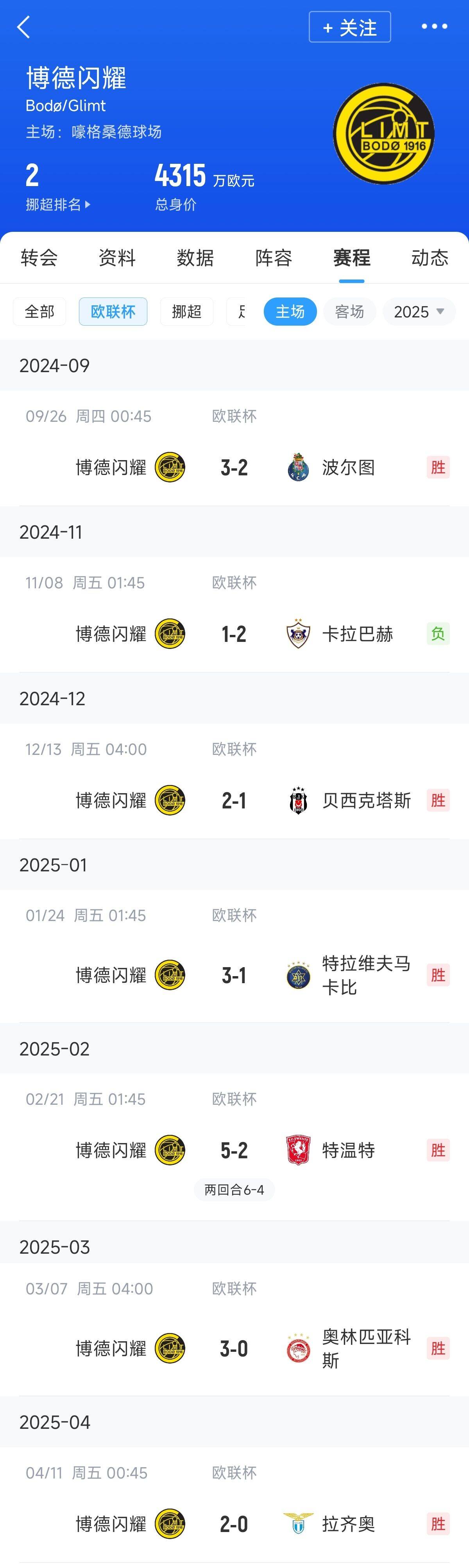 04月11日讯 欧联杯1/4决赛首回合,挪超豪门博德闪耀2-0击败意甲劲旅&欧联小组第1拉齐奥,本赛季欧联主场7战6胜。