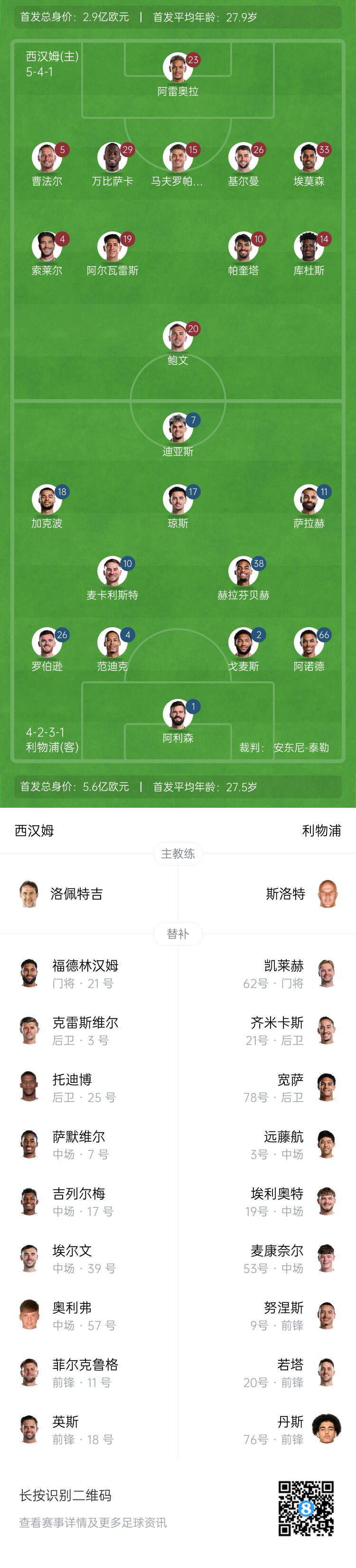 西汉姆首发:23-阿雷奥拉、29-万-比萨卡、5-曹法尔、26-基尔曼、15-马夫罗帕诺斯、33-埃莫森、19-埃德森-阿尔瓦雷斯、4-索莱尔、10-帕奎塔、20-鲍文、14-库杜斯