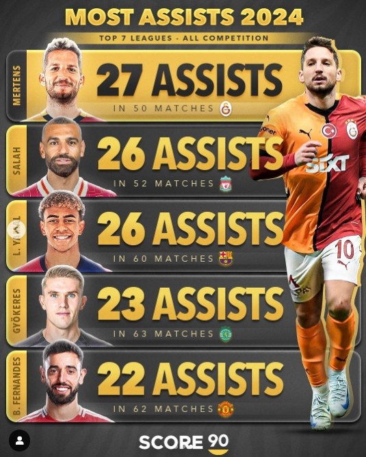 12月31日讯 score90统计了欧洲前7联赛各项赛事2024年助攻榜,加拉塔萨雷前锋默滕斯27次第1,萨拉赫、亚马尔26次第2。