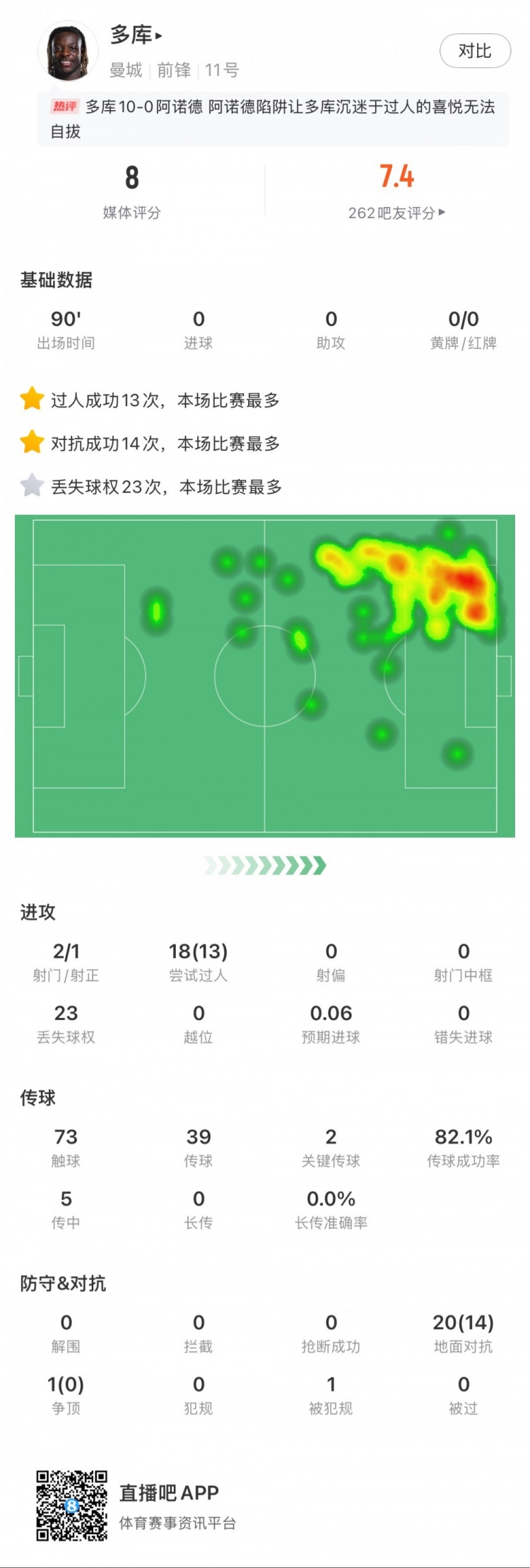 多库本场数据:13次成功过人,14次赢得对抗,23次丢失球权均最多