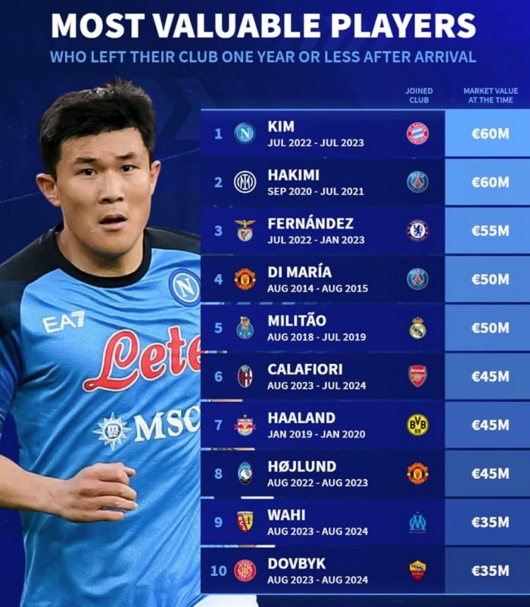 3月1日讯 《转会市场》统计了加盟球队一年内便转会离队的球员身价最贵榜单,金玟哉和阿什拉夫并列居首。加盟1年内离队球员的最贵德转身价榜:欧元1.金玟哉(那不勒斯→拜仁),6000万
