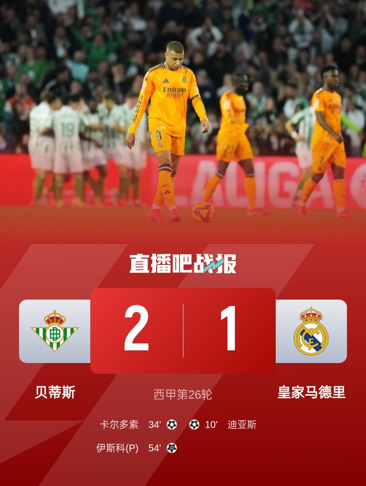 皇马本轮1-2不敌贝蒂斯,白衣军团在联赛输掉关键战役,近5轮仅1胜。