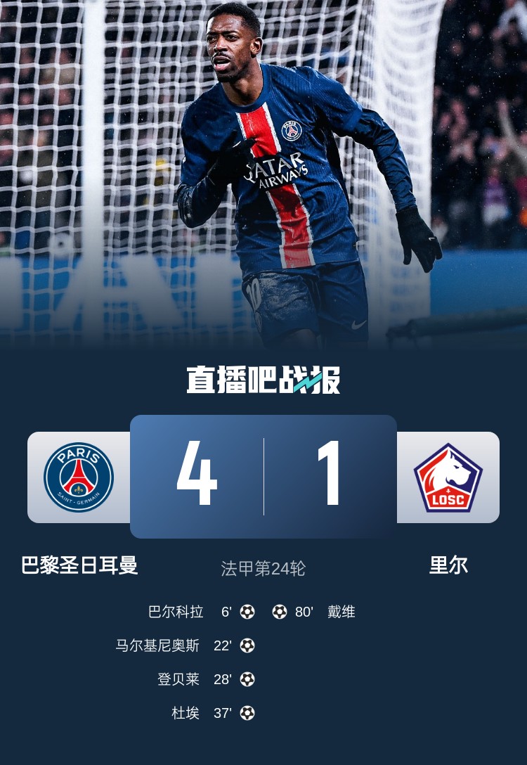 巴黎本轮4-1大胜里尔,此役后球队10连胜,以16分优势领跑。