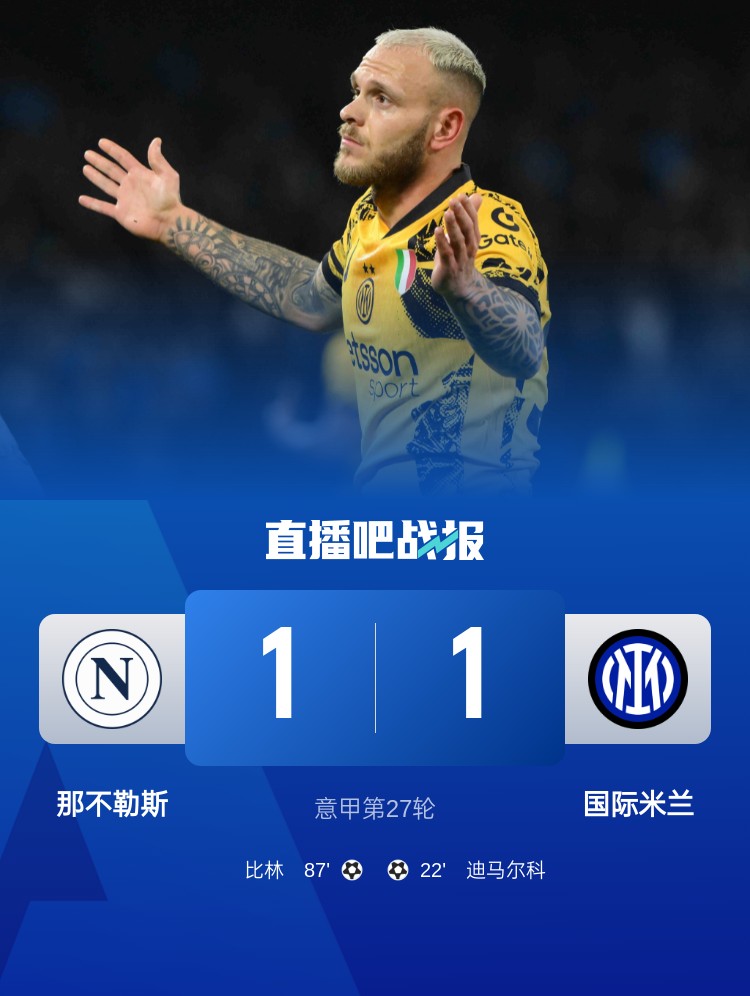 意甲本轮焦点大战,那不勒斯主场1-1战平国米,双方进球者为比林和迪马尔科,国米方面迪马尔科和恰20均伤退。