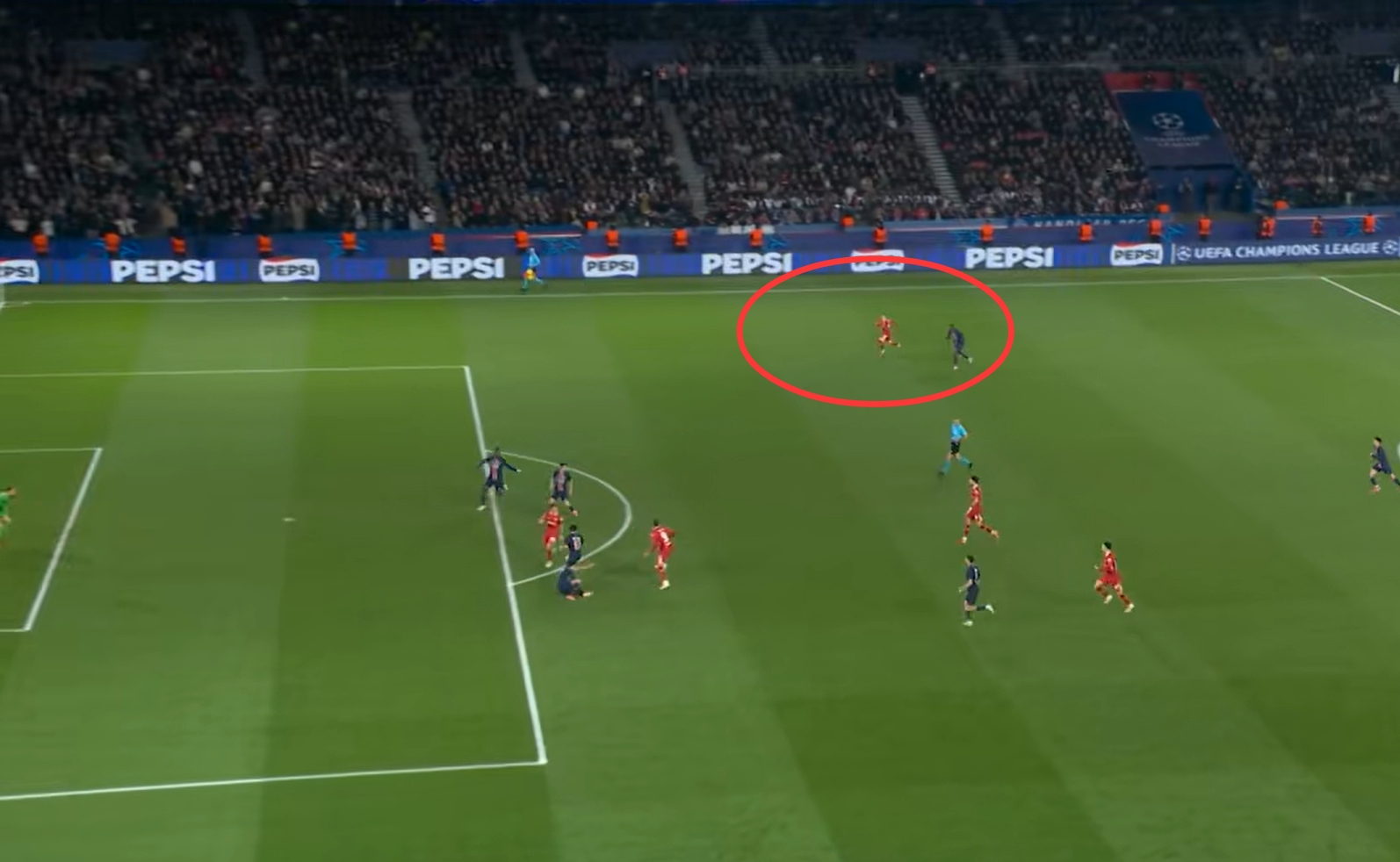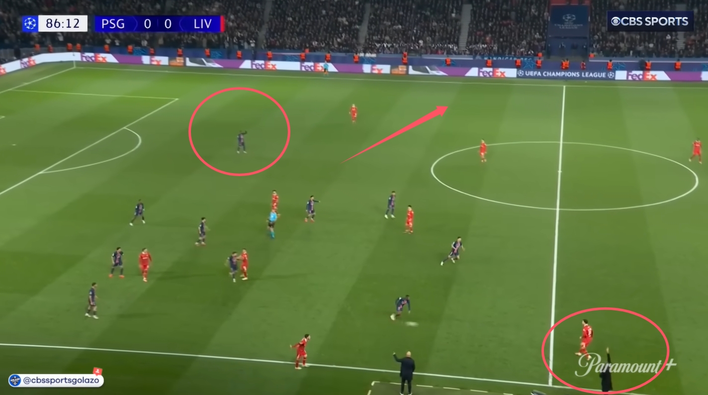 从转播视角可以看到,恩里克指挥远端的门德斯注意左边路防守,门德斯也举手示意表示收到,随后阿利森长传到左路,门德斯因为距离事发地较远,“散步”“看了会球”,但埃利奥特高速前插,打入绝杀,等到门德斯反应过来为时已晚。
