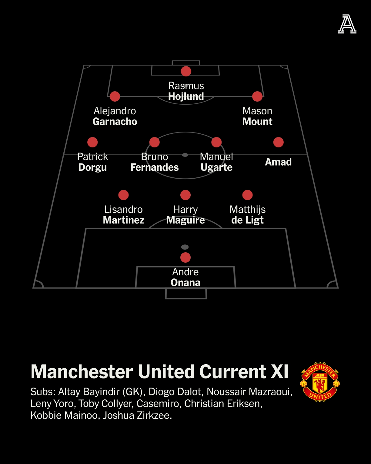 曼联现役首发:奥纳纳;利马、马奎尔、德里赫特;多古、B费、乌加特、阿玛德;加纳乔、霍伊伦、芒特