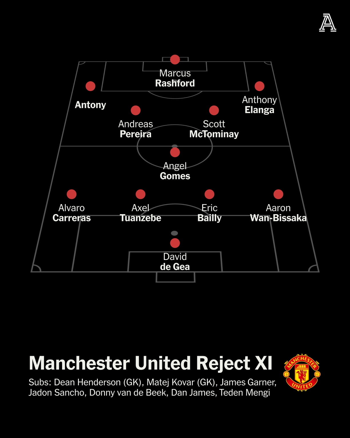 曼联弃将队首发:德赫亚;阿尔瓦罗-费尔南德斯、图安泽贝、拜利、万-比萨卡;安赫尔-戈麦斯、佩雷拉、麦克托米奈;安东尼、拉什福德、伊兰加曼联弃将队替补:迪恩-亨德森、科瓦尔、加