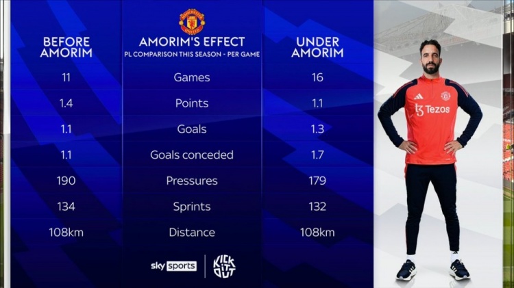 3月9日讯 曼联在本赛季处境艰难,《天空体育》也以“阿莫林效应”为题,对比了曼联换帅前后的英超场均关键数据。