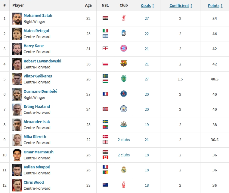 断档领先了!欧洲金靴排名:萨拉赫54分,领先第二名10分