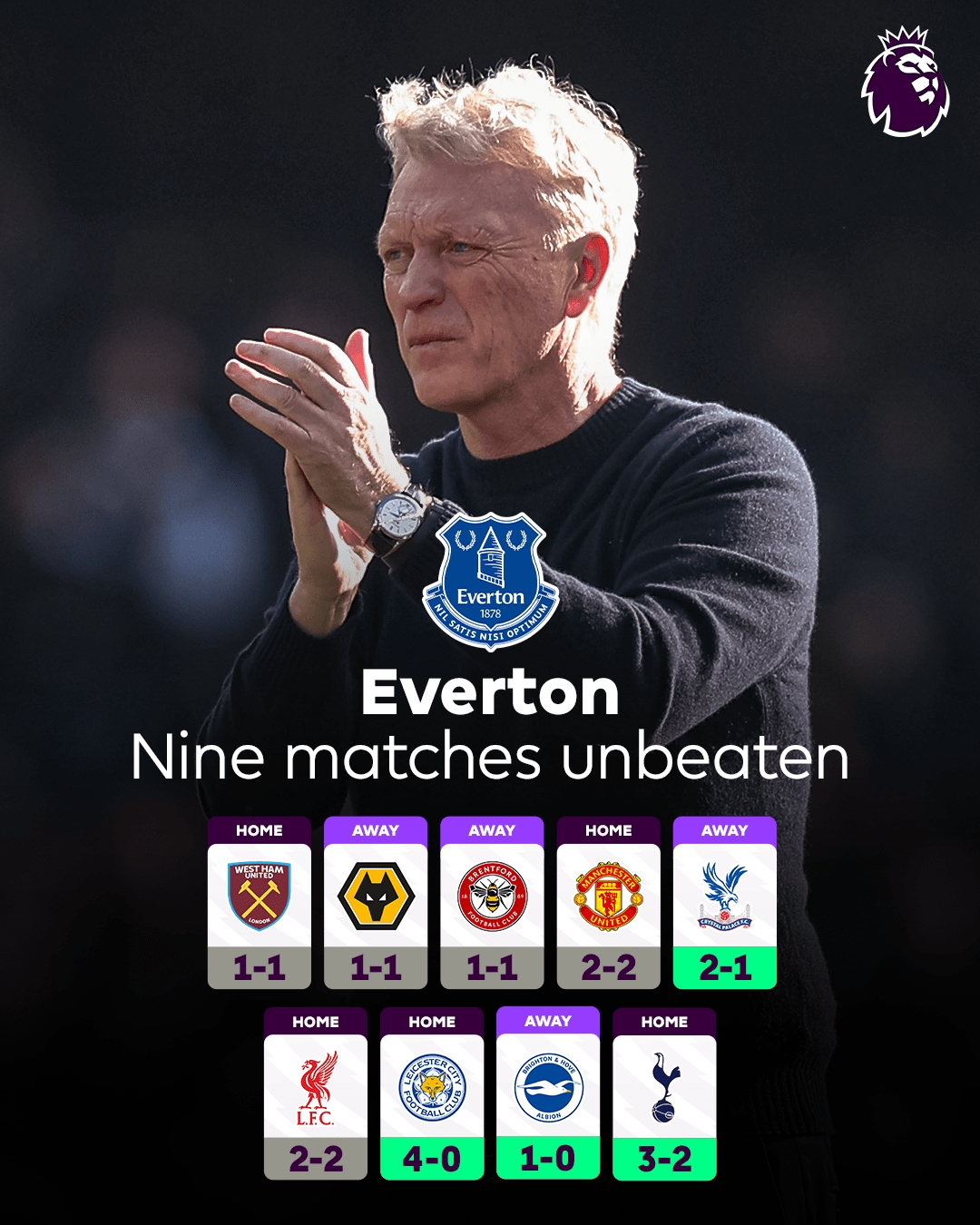 下赛季大干一场!莫耶斯率埃弗顿联赛9场不败,领先降级区17分