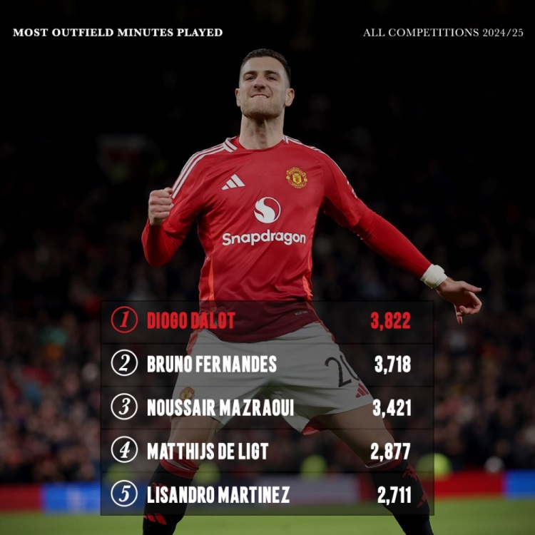 本赛季曼联非门将出场时间榜:达洛特压B费居首,马兹拉维在列