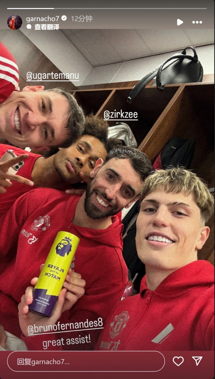 加纳乔在社交媒体上晒出与B费、齐尔克泽、乌加特赛后的更衣室合照,他手拿B费的全场最佳奖杯,配文:“很棒的助攻。”