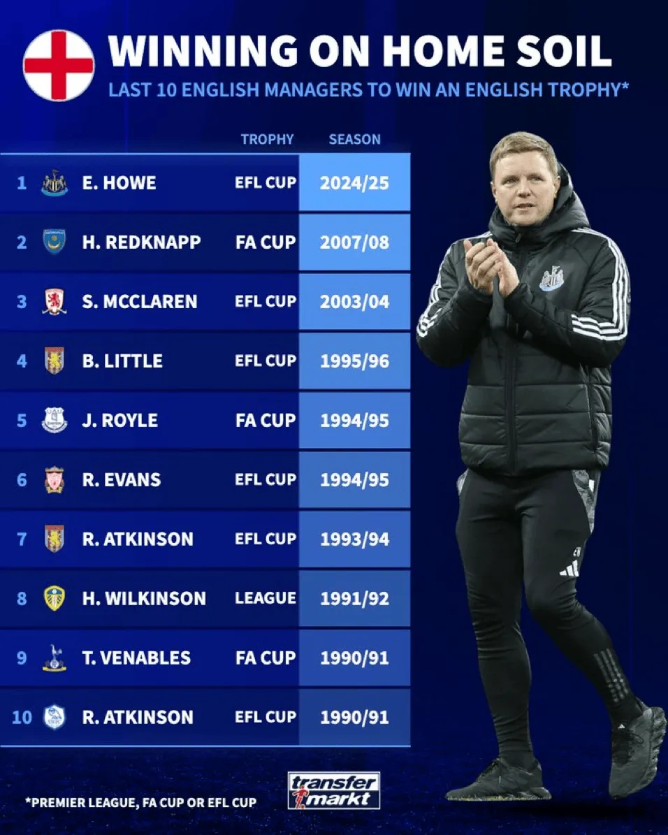 3月18日讯 纽卡在昨晚的联赛杯决赛2-1击败利物浦,埃迪-豪也成为近年来首位带队捧得国内冠军的英格兰本土主帅。近10位带队夺冠的英格兰本土主帅:仅限足总杯、联赛杯及英格兰顶