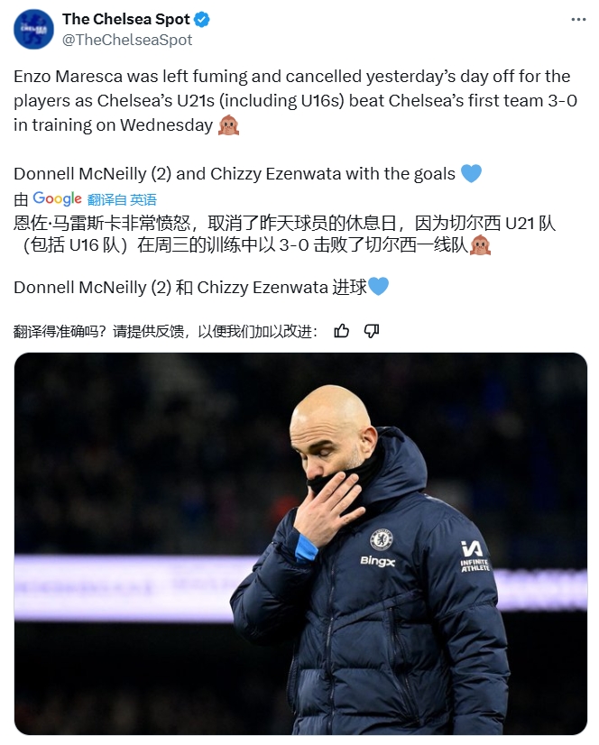 该博主表示,主帅马雷斯卡在一怒之下取消了切尔西球员昨天的休息日,原因是切尔西U21队(包含部分U16)在周三的训练中以3-0的比分击败了切尔西一线队。
