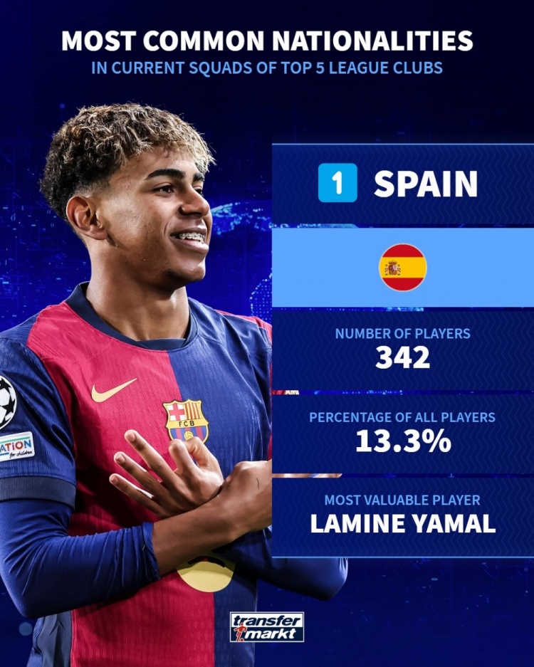 五大联赛各国球员数量排名:西班牙342人最多,法国、德国二三位