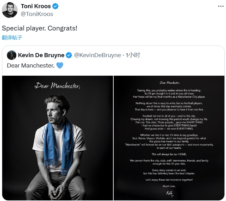 克罗斯转发了德布劳内的社媒,并配文写道:“特别的球员。祝福你!”