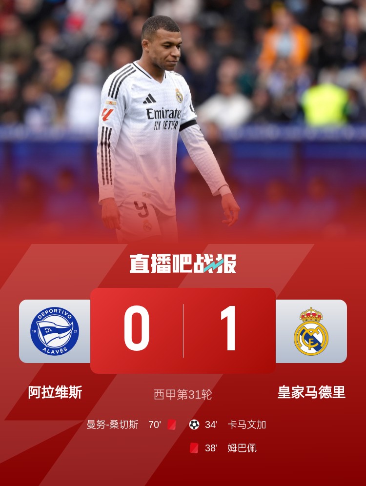 卡马文加世界波迎联赛首球,姆巴佩凶狠蹬踏对手小腿被直红罚下,最终十人皇马客场1-0战胜十人阿拉维斯。