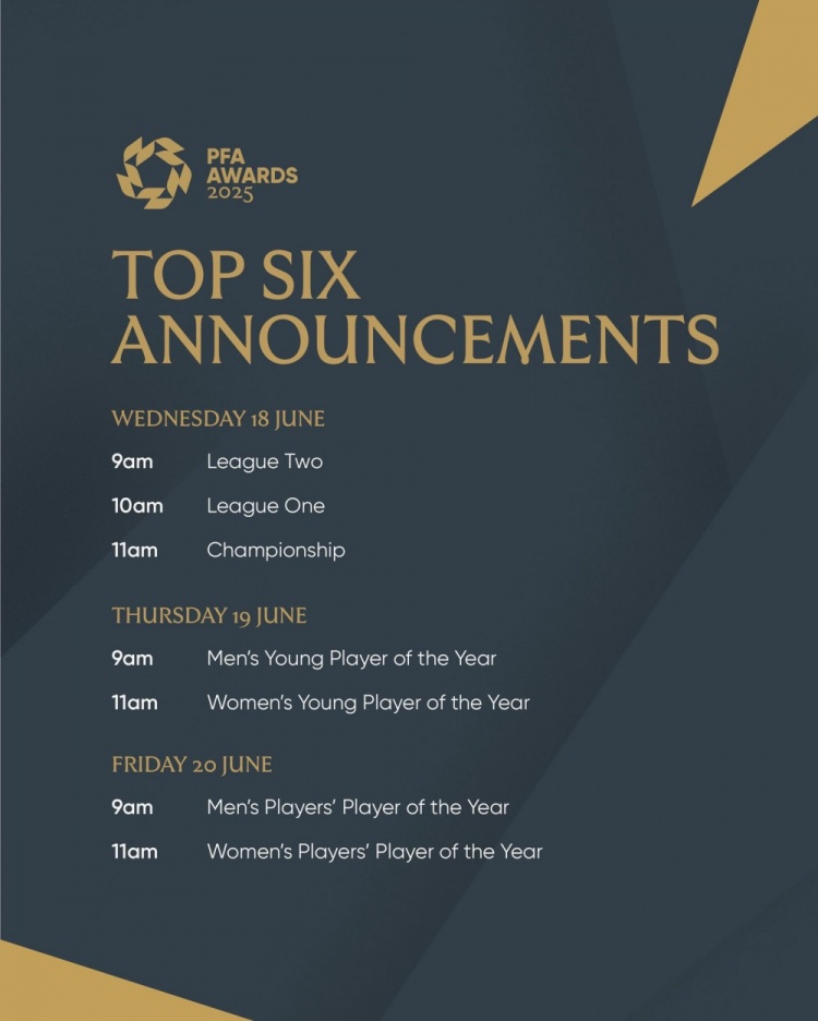 官方:PFA将在6月20日公布年度最佳男足、女足球员