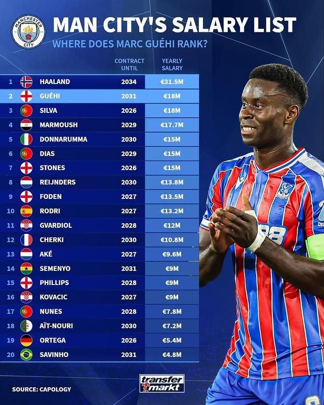 在曼城官宣格伊加盟后,德转市场发布了曼城队内的年薪榜单。哈兰德3150万欧居首,格伊和B席1800万欧位列次席。曼城队内年薪TOP201.哈兰德 3150万欧元 合同至2034年2.格伊 1800