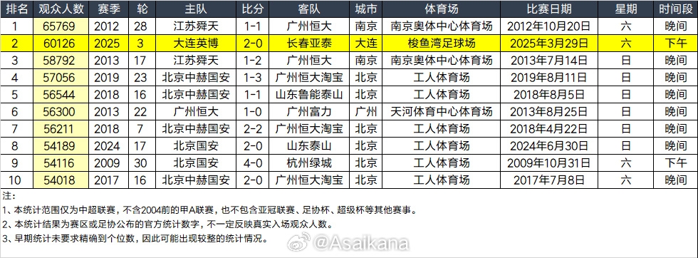 朱艺:今天,本轮(2025赛季中超第3轮)大连英博和长春亚泰的比赛吸引了60126名观众现场观战,这也是大连英博的首个中超主场比赛。这一数据在中超历史上排名第二,仅次于2012年南京奥体的65769人。这也是继那场之后中超联赛第二次有超过六万名观众现场观赛。
