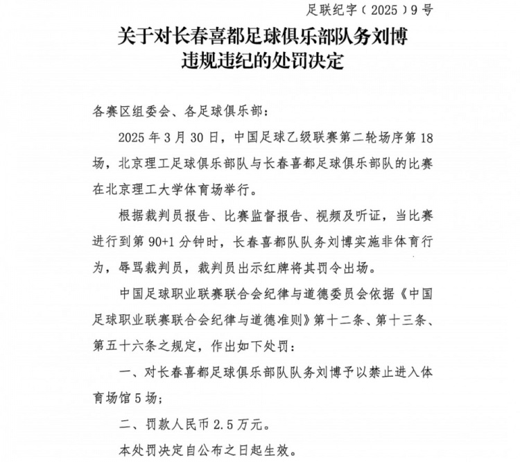 中足联:长春喜都队务刘博辱骂裁判员,禁赛5场+罚款2.5万