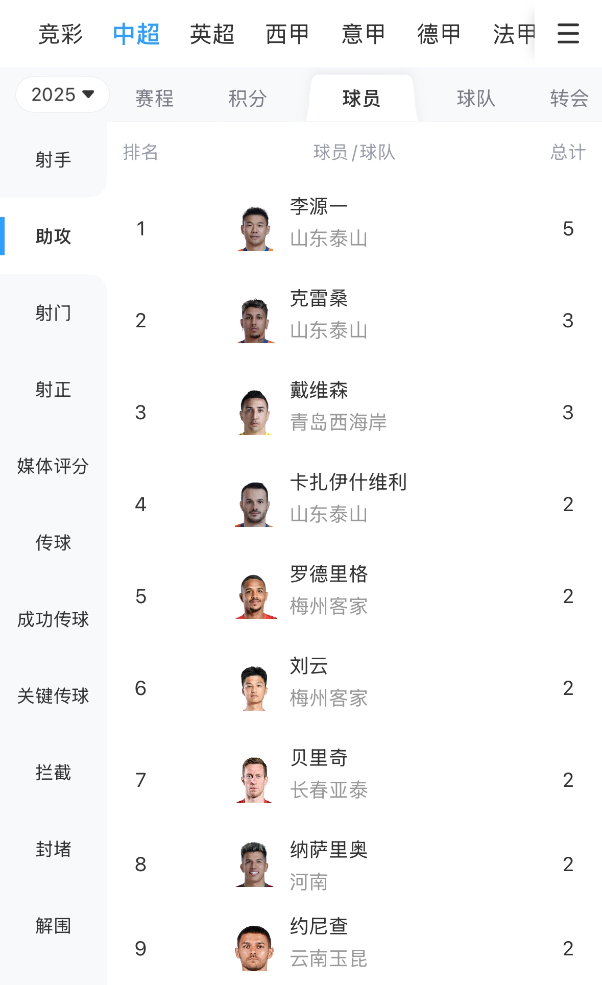 04月12日讯 中超第6轮,泰山队4-0大胜新鹏城。李源一本场任意球破门,本赛季中超6轮比赛李源一6场1球5助,领跑中超助攻榜。当前中超助攻榜前四有三名山东泰山球员↓