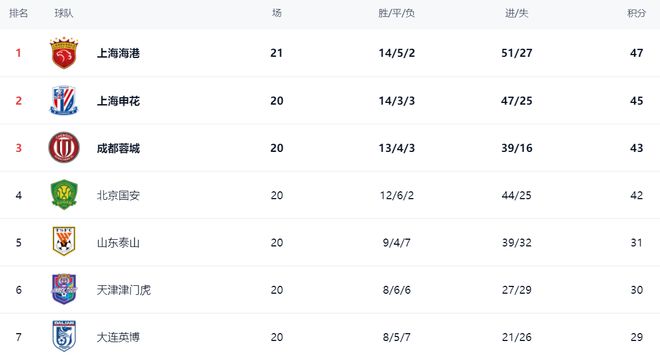 上海申花的战绩则是14胜3平3负,拿到45分,以2分的差距掉到第2的位置。不过,上海申花比上海海港少赛一场。如果接下来上海申花能够在客场击败浙江队的话,就能够重夺榜首位置。只是近段时间上海申花状态不大好,要想击败浙江队也不是容易的事。成都蓉城以43分排名第3。第4的则是北京国安,拿到42分。北京国安在少赛一场的情况下也只是比上海海港少5分。显然,冠军的争夺依然非常激烈,前4的球队都有机会争冠。