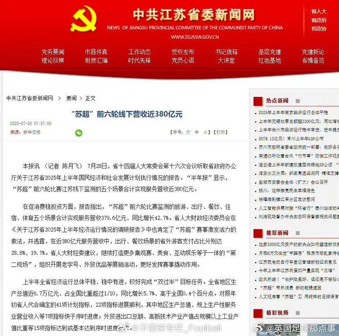 还有一个例子是官方媒体称苏超前6轮线下营收380亿:这是一个简单的数学题,6轮380亿,每轮超60亿;1轮6场,每场超10亿;每场哪怕按5万人算,人均贡献2万元线下消费,这是一个显而易见的“统计学”数字。