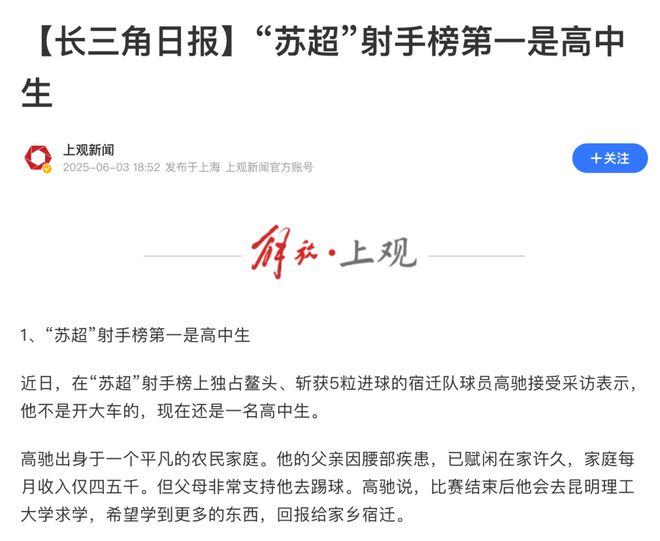 一方面,官方追求讲“好故事”,总是会有些“不择手段”。比如目前还并列射手榜首的高驰,一个江苏青训体系出身、前两年还在代表沧州雄狮踢青年联赛的小将,在22岁的年纪因为球队解散“要去读大学”而被宣传成了高中生。