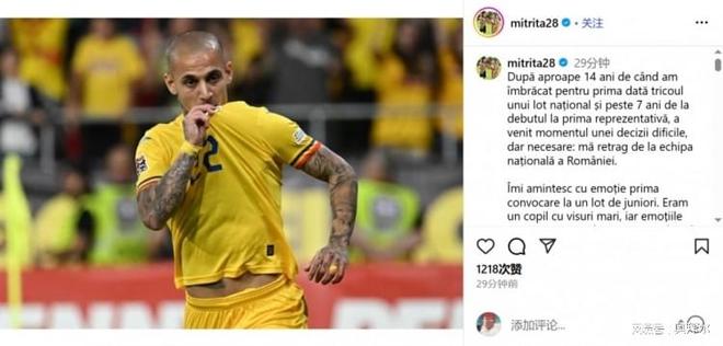 周一,米特里策宣布从罗马尼亚国家队退役。在声明中,米特里策表示,“我效力中超,短暂的时间让我继续为国家队出场变得更加困难。”