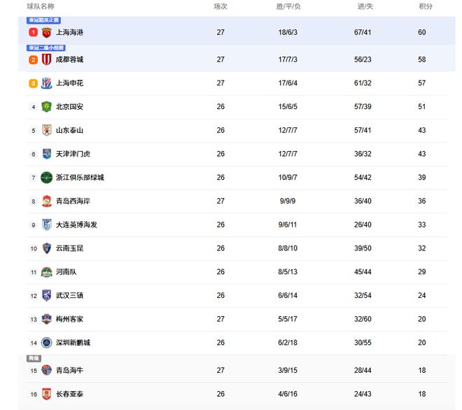 随着申花21,蓉城31,海港43,中超积分:3队争冠,4队保级