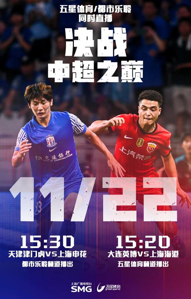 明天,本赛季中超联赛即将迎来收官之战,末轮八场比赛同时开打!而“申城双雄”上海海港和上海申花的比赛结果也将直接决定本赛季中超冠军的归属!终局之战,一触即发!五星体育和都市乐聆频道将分别在明天15:20和15:30为大家带来上海海港与上海申花的比赛转播,敬请关注!