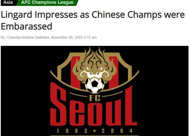 这篇文章高度表扬了一传两射的林加德帮助首尔FC以3比1击败中超联赛冠军,让球队在东区前五场比赛中取得八分。紧接着,文章写道:上海海港则积1分排名东亚区的小组垫底。中超三连冠的四冠王排名倒数第一,你说尴尬不尴尬?正好对了文章标题。
