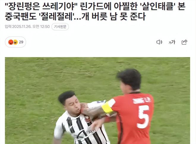 韩媒对张琳芃给林加德的凶铲进行了狠批,标题大意是林加德险遭凶狠飞铲,连中国球迷看了都直摇头。文章配图有两张图片,一张是张琳芃手推林皇面部(上图)标,另一张是飞铲时的镜头(下图)。