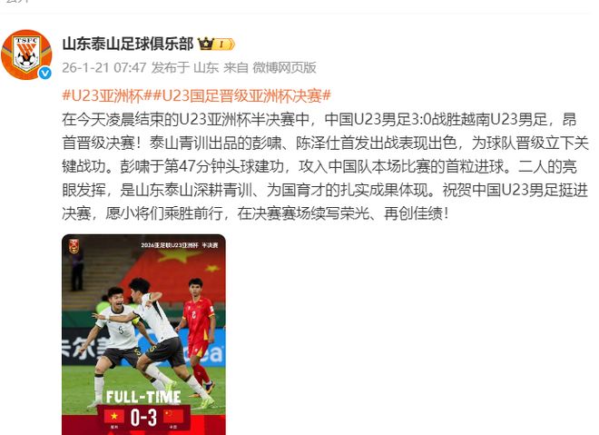 山东泰山官方对两位小将的表现予以肯定:“泰山青训出品的彭啸、陈泽仕首发出战表现出色,为球队晋级立下关键战功。彭啸于第47分钟头球建功,攻入中国队本场比赛的首粒进球。二人的亮眼发挥,是山东泰山深耕青训、为国育才的扎实成果体现。祝贺中国U23男足挺进决赛,愿小将们乘胜前行,在决赛赛场续写荣光、再创佳绩!”